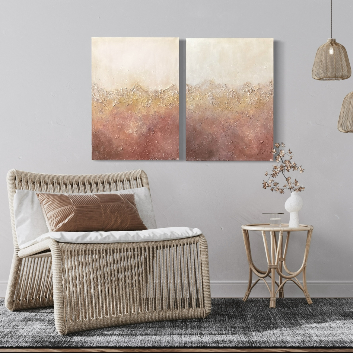 Home Quadro Texturizado Quadros "Sahara" Set 2 - 70x50cm Quadros "Sahara" Set 2 - 70x50cm 310,00 € Desconto de %. IVA incluído. O produto encontra-se sem stock. Adicionar à wishlist Composto por dois quadros que se complementam em tela branca texturizado com relevo em tons terracotta. Pode ser encomendado noutras cores. A peça é feita à mão em Portugal e cada relevo é único. Dimensões: 2 Quadros cada um com 70x50cm Instruções de manutenção: passar com um pano seco ou espanador. Marca Quadros Texturizados Características Partilhar